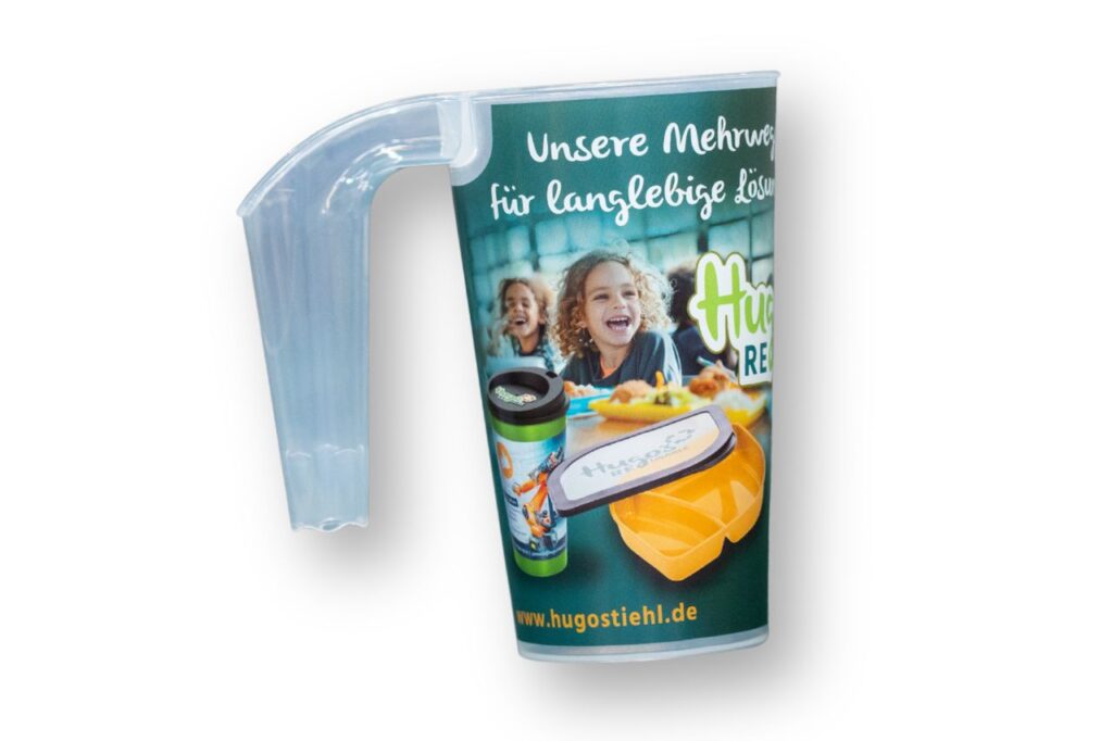 Trotz des Henkels lassen sich die Becher problemlos ineinander stapeln, wodurch Lagerung und Rückführung im Mehrwegsystem deutlich erleichtert werden.