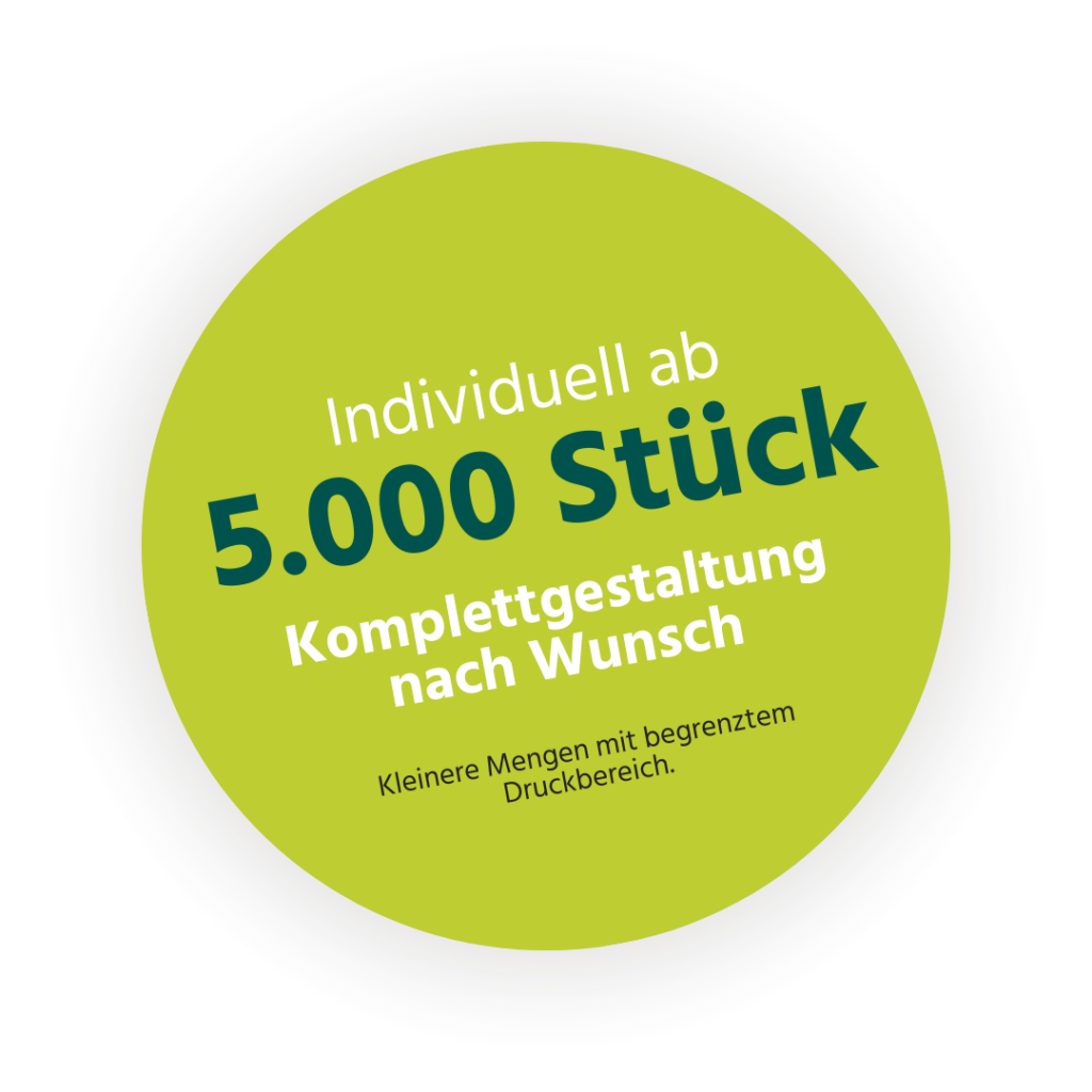 Bereits ab 5000 Stück ist eine komplette Gestaltung nach Wunsch möglich, kleinere Mengen können mit einem begrenzten Druckbereich umgesetzt werden.