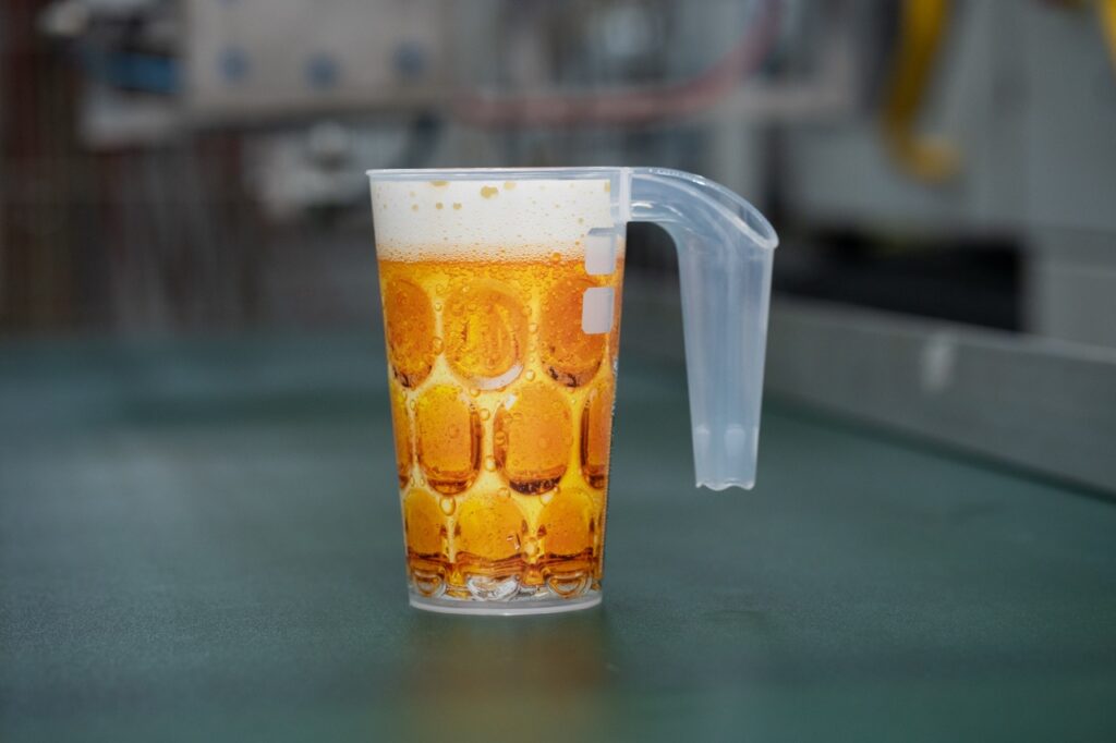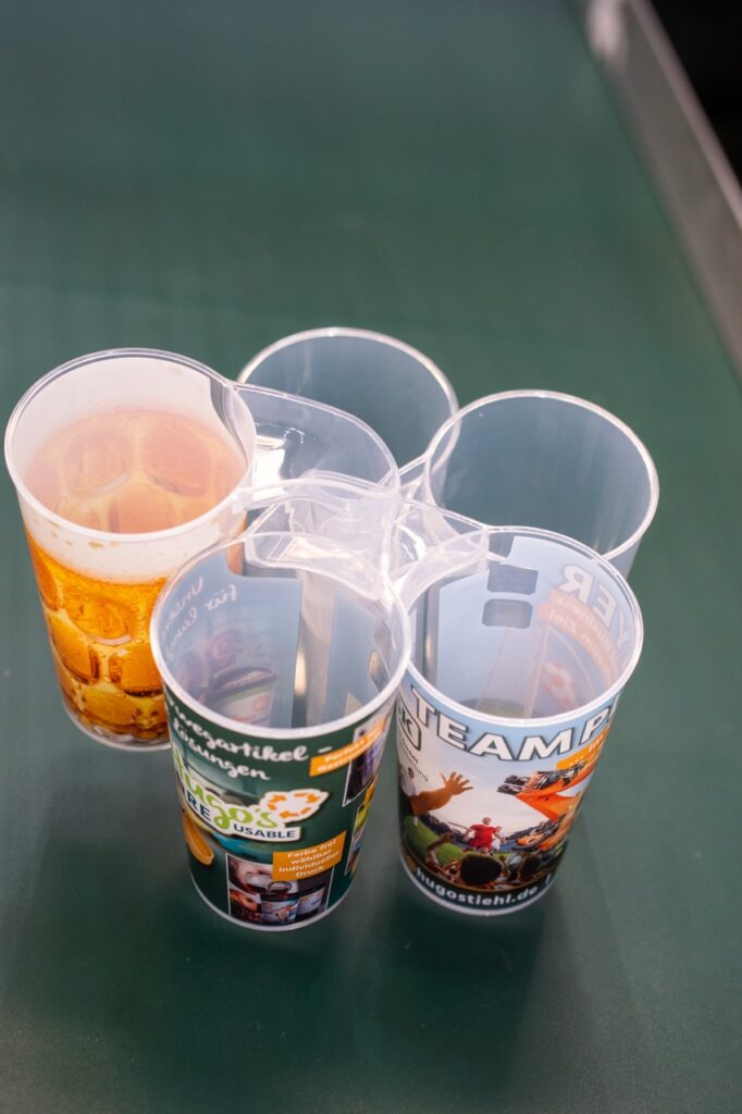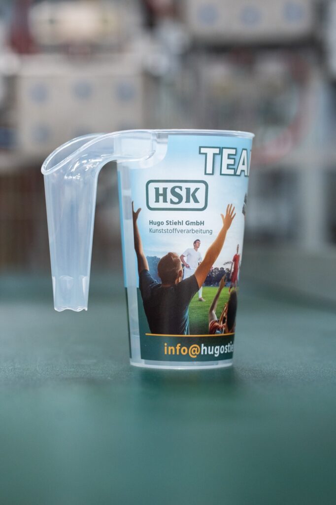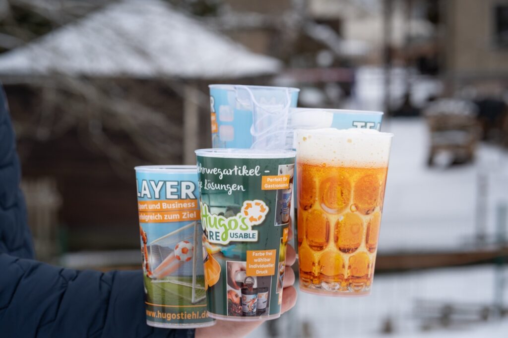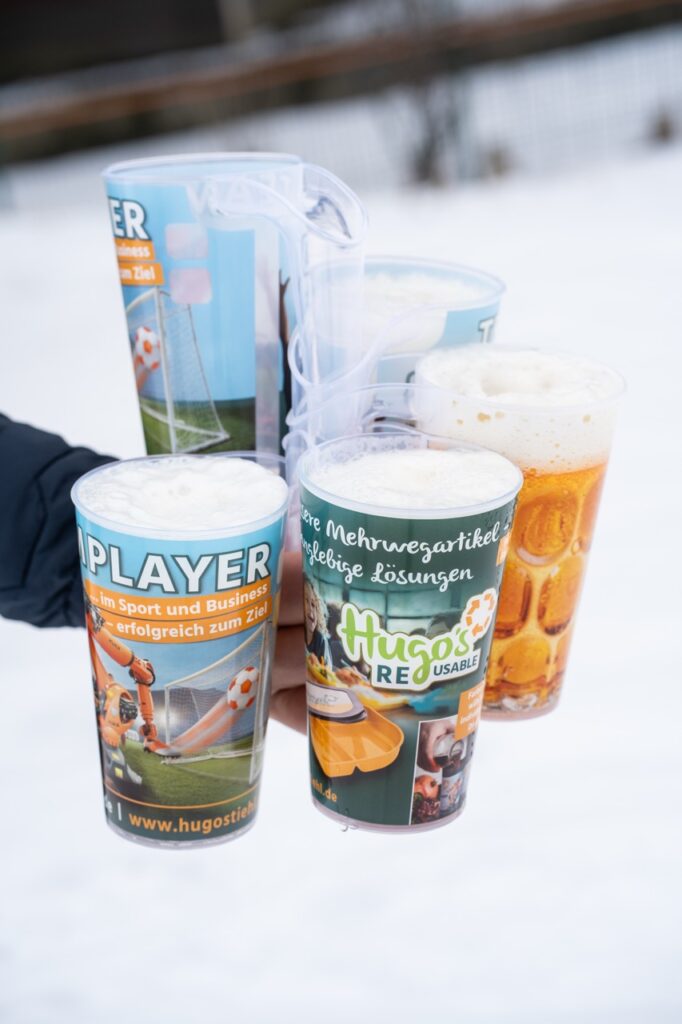 Der integrierte Henkel bietet sicheren Halt und ermöglicht den entspannten Transport mehrerer Becher. Gleichzeitig lassen sie sich individuell gestalten und bereits in kleinen Mengen umsetzen, sodass sie optisch genau zu Verein, Event oder Unternehmen passen.