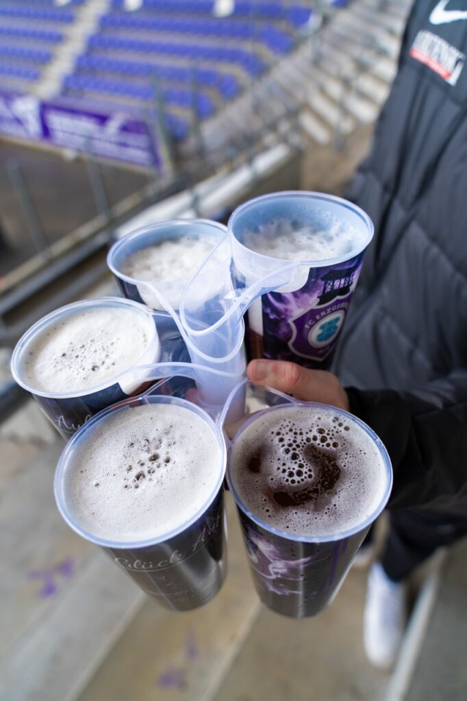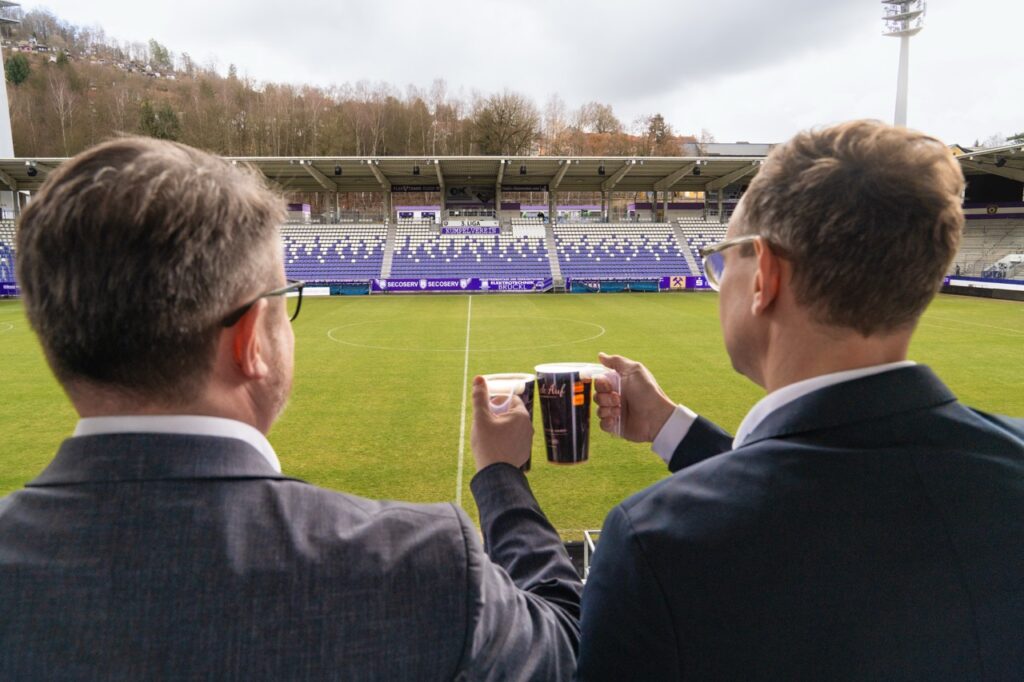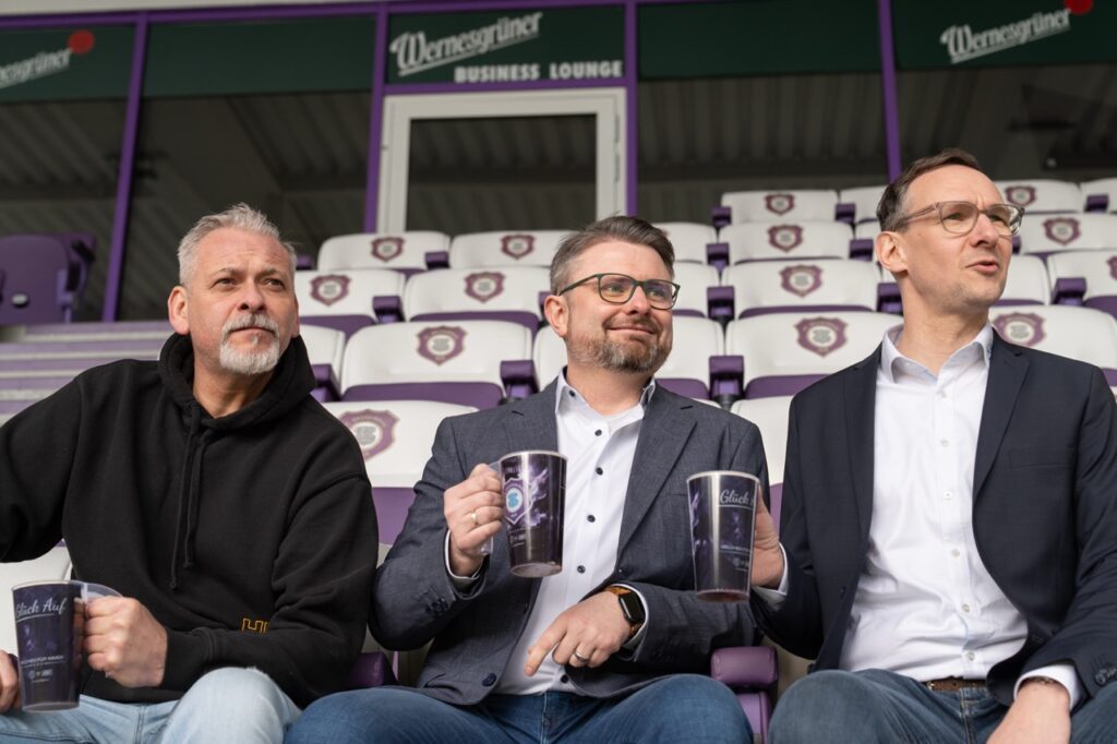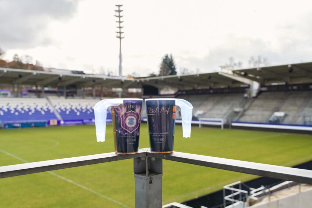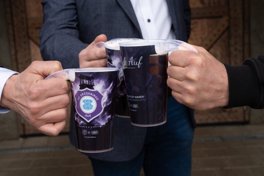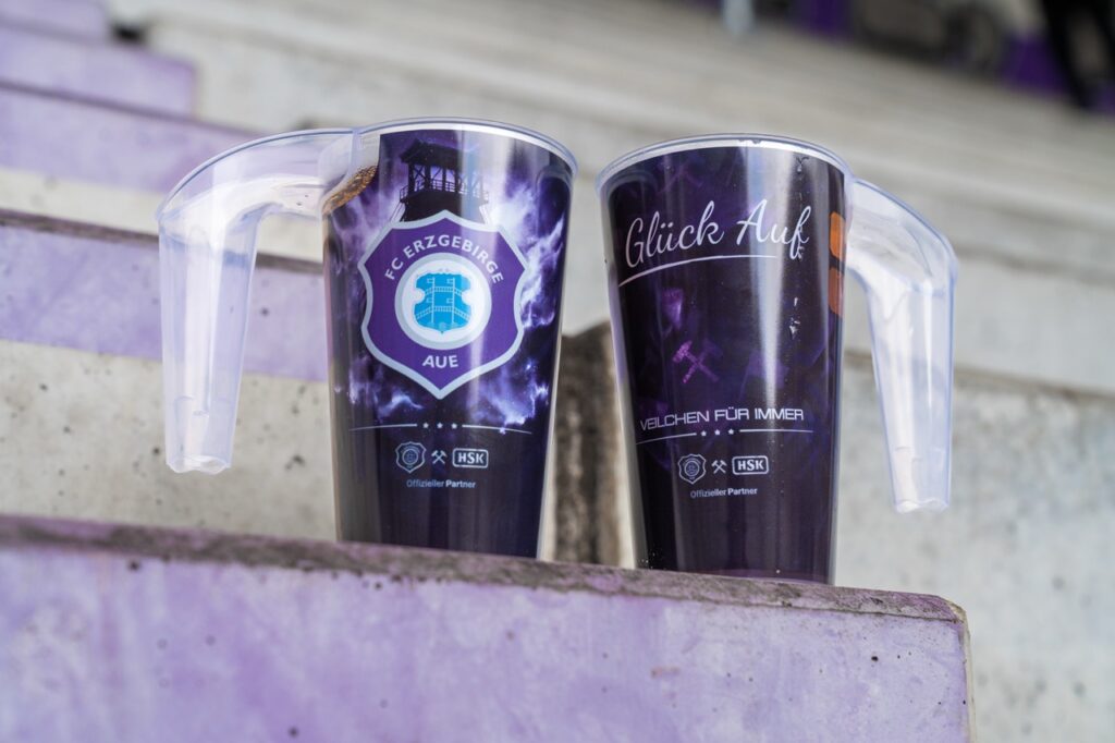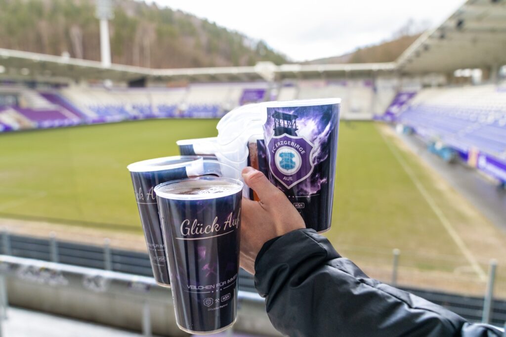 Entstanden ist dieses Projekt in enger Abstimmung zwischen dem FC Erzgebirge Aue, dem Veilchencatering, dem verantwortlichen Logistikdienstleister und der Hugo Stiehl GmbH. Ziel war es, eine Lösung zu entwickeln, die nicht nur optisch zum Verein passt, sondern organisatorisch und technisch dauerhaft funktioniert. Der Becher ist für den langfristigen Mehrfacheinsatz ausgelegt, robust in der Nutzung und eingebunden in einen klar strukturierten Reinigungs- und Transportkreislauf. So entsteht ein System, das Servicequalität, Sauberkeit und Ressourcenschonung miteinander verbindet.